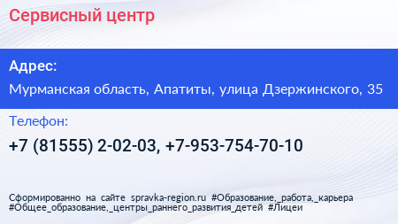 Сервисный центр по адресу Мурманская область, Апатиты, улица Дзержинского, 35 в дальнейшем Организация, размещена в следующих категориях: