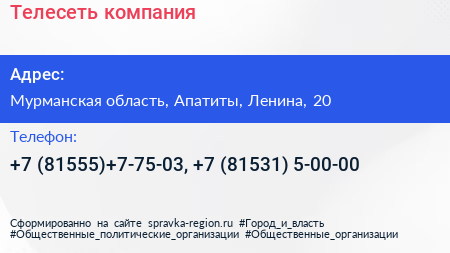 Телесеть, компания по адресу Мурманская область, Апатиты, Ленина, 20 в дальнейшем Организация, размещена в следующих категориях: