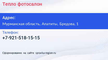 Тепло, фотосалон по адресу Мурманская область, Апатиты, Бредова, 1 в дальнейшем Организация, размещена в следующих категориях: