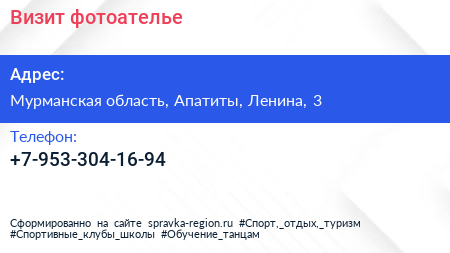 Визит, фотоателье по адресу Мурманская область, Апатиты, Ленина, 3 в дальнейшем Организация, размещена в следующих категориях: