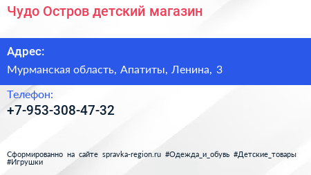 Чудо-Остров, детский магазин по адресу Мурманская область, Апатиты, Ленина, 3 в дальнейшем Организация, размещена в следующих категориях:
