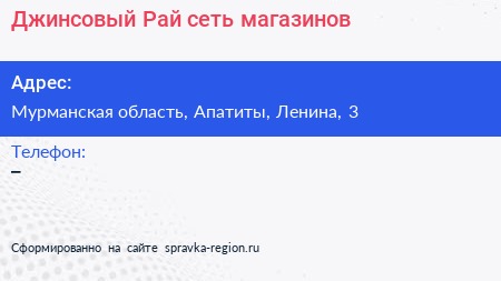 Джинсовый Рай, сеть магазинов по адресу Мурманская область, Апатиты, Ленина, 3 в дальнейшем Организация, размещена в следующих категориях: