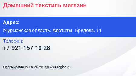Домашний текстиль, магазин по адресу Мурманская область, Апатиты, Бредова, 11 в дальнейшем Организация, размещена в следующих категориях: