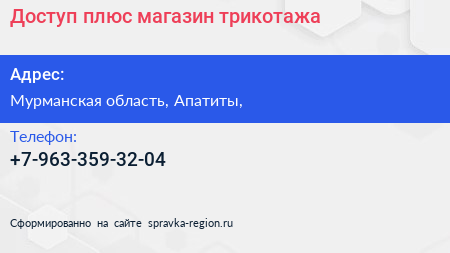 Доступ плюс, магазин трикотажа по адресу Мурманская область, Апатиты, в дальнейшем Организация, размещена в следующих категориях: