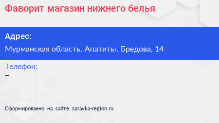 Фаворит, магазин нижнего белья по адресу Мурманская область, Апатиты, Бредова, 14 в дальнейшем Организация, размещена в следующих категориях: