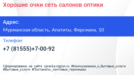 Хорошие очки, сеть салонов оптики по адресу Мурманская область, Апатиты, Ферсмана, 10 в дальнейшем Организация, размещена в следующих категориях: