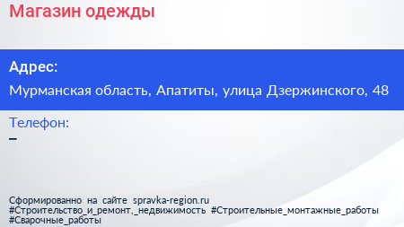 Магазин одежды по адресу Мурманская область, Апатиты, улица Дзержинского, 48 в дальнейшем Организация, размещена в следующих категориях: