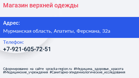 Магазин верхней одежды по адресу Мурманская область, Апатиты, Ферсмана, 32а в дальнейшем Организация, размещена в следующих категориях: