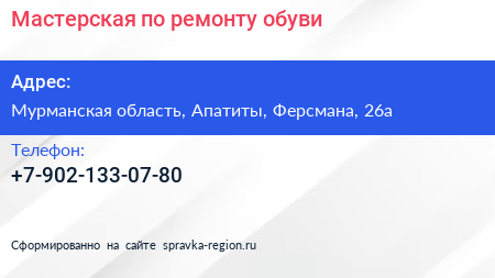 Мастерская по ремонту обуви по адресу Мурманская область, Апатиты, Ферсмана, 26а в дальнейшем Организация, размещена в следующих категориях: