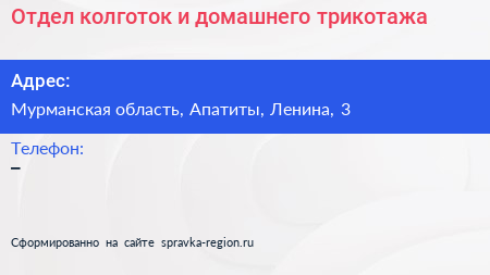 Отдел колготок и домашнего трикотажа по адресу Мурманская область, Апатиты, Ленина, 3 в дальнейшем Организация, размещена в следующих категориях: