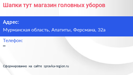 Шапки тут, магазин головных уборов по адресу Мурманская область, Апатиты, Ферсмана, 32а в дальнейшем Организация, размещена в следующих категориях: