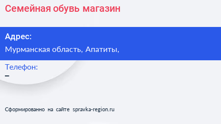 Семейная обувь, магазин по адресу Мурманская область, Апатиты, в дальнейшем Организация, размещена в следующих категориях: