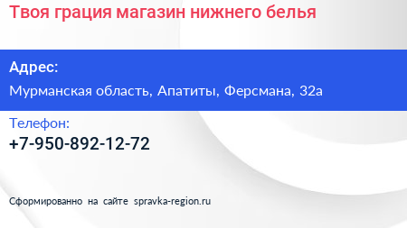 Твоя грация, магазин нижнего белья по адресу Мурманская область, Апатиты, Ферсмана, 32а в дальнейшем Организация, размещена в следующих категориях: