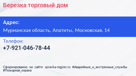 Березка, торговый дом по адресу Мурманская область, Апатиты, Московская, 14 в дальнейшем Организация, размещена в следующих категориях: