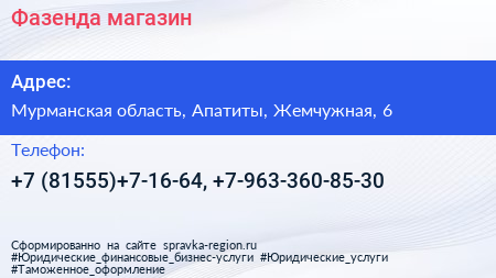 Фазенда, магазин по адресу Мурманская область, Апатиты, Жемчужная, 6 в дальнейшем Организация, размещена в следующих категориях: