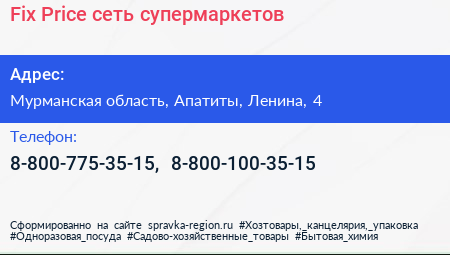 Fix Price, сеть супермаркетов по адресу Мурманская область, Апатиты, Ленина, 4 в дальнейшем Организация, размещена в следующих категориях: