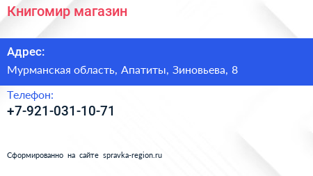 Книгомир, магазин по адресу Мурманская область, Апатиты, Зиновьева, 8 в дальнейшем Организация, размещена в следующих категориях: