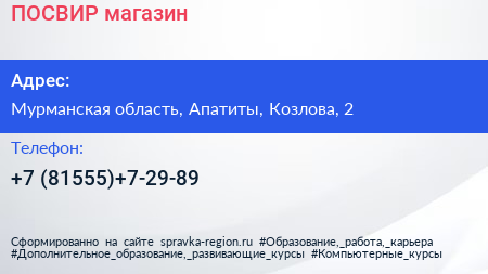 ПОСВИР, магазин по адресу Мурманская область, Апатиты, Козлова, 2 в дальнейшем Организация, размещена в следующих категориях:
