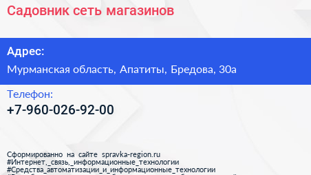 Садовник, сеть магазинов по адресу Мурманская область, Апатиты, Бредова, 30а в дальнейшем Организация, размещена в следующих категориях: