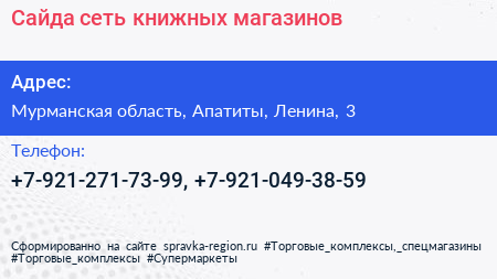 Сайда, сеть книжных магазинов по адресу Мурманская область, Апатиты, Ленина, 3 в дальнейшем Организация, размещена в следующих категориях: