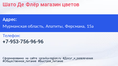 Шато Де Флёр, магазин цветов по адресу Мурманская область, Апатиты, Ферсмана, 15а в дальнейшем Организация, размещена в следующих категориях: