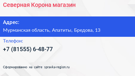 Северная Корона, магазин по адресу Мурманская область, Апатиты, Бредова, 13 в дальнейшем Организация, размещена в следующих категориях: