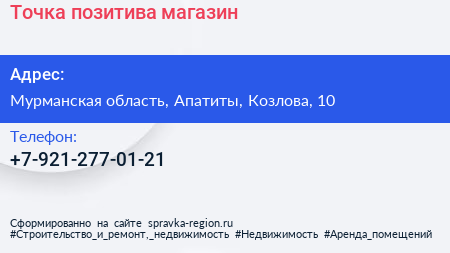 Точка позитива, магазин по адресу Мурманская область, Апатиты, Козлова, 10 в дальнейшем Организация, размещена в следующих категориях: