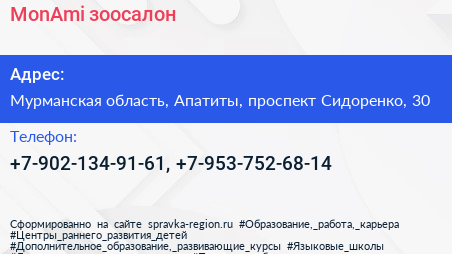 MonAmi, зоосалон по адресу Мурманская область, Апатиты, проспект Сидоренко, 30 в дальнейшем Организация, размещена в следующих категориях: