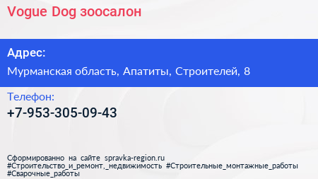 Vogue Dog, зоосалон по адресу Мурманская область, Апатиты, Строителей, 8 в дальнейшем Организация, размещена в следующих категориях: