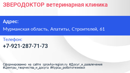 ЗВЕРОДОКТОР, ветеринарная клиника по адресу Мурманская область, Апатиты, Строителей, 61 в дальнейшем Организация, размещена в следующих категориях: