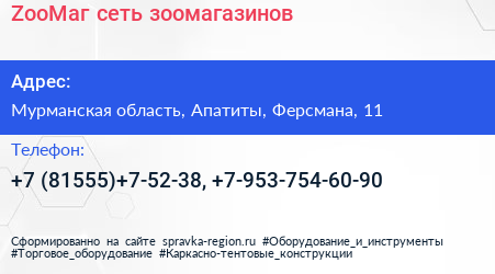 ZooМаг, сеть зоомагазинов по адресу Мурманская область, Апатиты, Ферсмана, 11 в дальнейшем Организация, размещена в следующих категориях: