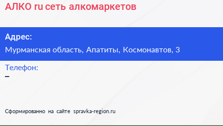АЛКО.ru, сеть алкомаркетов по адресу Мурманская область, Апатиты, Космонавтов, 3 в дальнейшем Организация, размещена в следующих категориях: