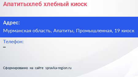Апатитыхлеб, хлебный киоск по адресу Мурманская область, Апатиты, Промышленная, 19 киоск в дальнейшем Организация, размещена в следующих категориях: