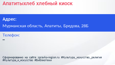Апатитыхлеб, хлебный киоск по адресу Мурманская область, Апатиты, Бредова, 28Б в дальнейшем Организация, размещена в следующих категориях: