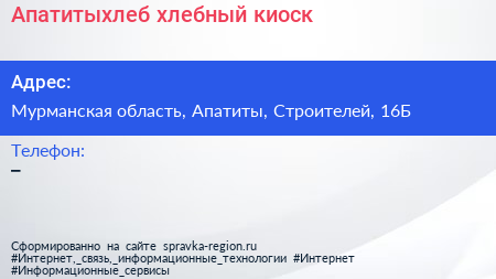 Апатитыхлеб, хлебный киоск по адресу Мурманская область, Апатиты, Строителей, 16Б в дальнейшем Организация, размещена в следующих категориях: