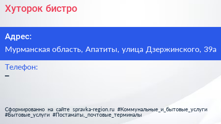 Хуторок, бистро по адресу Мурманская область, Апатиты, улица Дзержинского, 39а в дальнейшем Организация, размещена в следующих категориях: