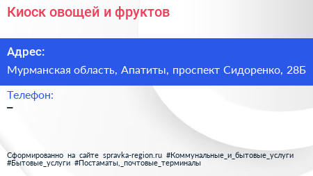 Киоск овощей и фруктов по адресу Мурманская область, Апатиты, проспект Сидоренко, 28Б в дальнейшем Организация, размещена в следующих категориях: