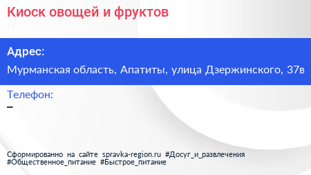 Киоск овощей и фруктов по адресу Мурманская область, Апатиты, улица Дзержинского, 37в в дальнейшем Организация, размещена в следующих категориях: