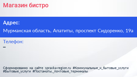 Магазин-бистро по адресу Мурманская область, Апатиты, проспект Сидоренко, 19а в дальнейшем Организация, размещена в следующих категориях: