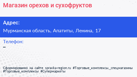Магазин орехов и сухофруктов по адресу Мурманская область, Апатиты, Ленина, 17 в дальнейшем Организация, размещена в следующих категориях: