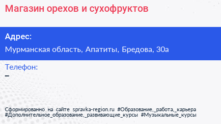 Магазин орехов и сухофруктов по адресу Мурманская область, Апатиты, Бредова, 30а в дальнейшем Организация, размещена в следующих категориях: