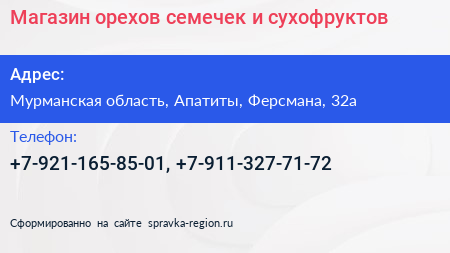 Магазин орехов, семечек и сухофруктов по адресу Мурманская область, Апатиты, Ферсмана, 32а в дальнейшем Организация, размещена в следующих категориях: