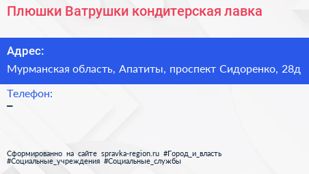 Плюшки-Ватрушки, кондитерская лавка по адресу Мурманская область, Апатиты, проспект Сидоренко, 28д в дальнейшем Организация, размещена в следующих категориях: