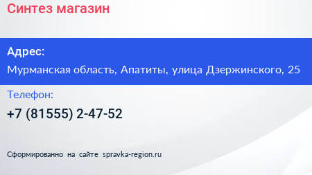 Синтез, магазин по адресу Мурманская область, Апатиты, улица Дзержинского, 25 в дальнейшем Организация, размещена в следующих категориях: