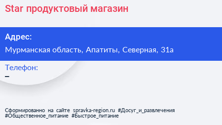 Star, продуктовый магазин по адресу Мурманская область, Апатиты, Северная, 31а в дальнейшем Организация, размещена в следующих категориях: