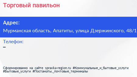 Торговый павильон по адресу Мурманская область, Апатиты, улица Дзержинского, 48/1 в дальнейшем Организация, размещена в следующих категориях: