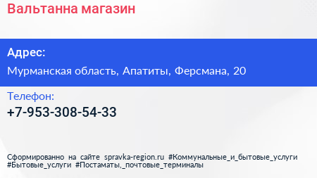 Вальтанна, магазин по адресу Мурманская область, Апатиты, Ферсмана, 20 в дальнейшем Организация, размещена в следующих категориях: