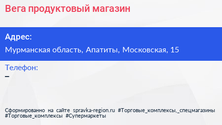 Вега, продуктовый магазин по адресу Мурманская область, Апатиты, Московская, 15 в дальнейшем Организация, размещена в следующих категориях: