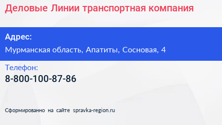 Деловые Линии, транспортная компания по адресу Мурманская область, Апатиты, Сосновая, 4 в дальнейшем Организация, размещена в следующих категориях: