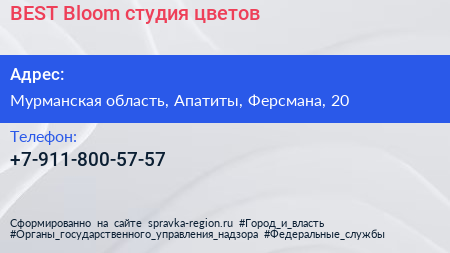 BEST-Bloom, студия цветов по адресу Мурманская область, Апатиты, Ферсмана, 20 в дальнейшем Организация, размещена в следующих категориях: